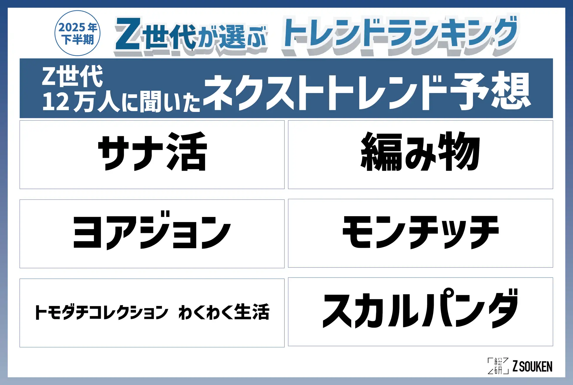 Z世代向けシンクタンク「Z総研」が、Nom de plume読者および独自コミュニティを対象に2025年下半期のトレンド調査を実施し、「2025年下半期トレンドランキング」を発表した。あわせて、Z世代約12万人の声をもとに編集部が選定した「2026年上半期ネクストトレンド予想」も公開された。