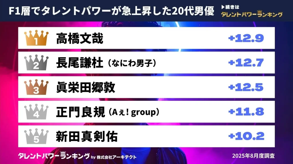 タレントパワーランキングは、業界最大規模のタレント調査をもとに、F1層(20〜34歳女性)でタレントパワーが急上昇した20代男優ランキングを発表した。調査は2025年11月20日時点で20代の男優を対象に、F1層の回答によるスコアから集計されたもの。