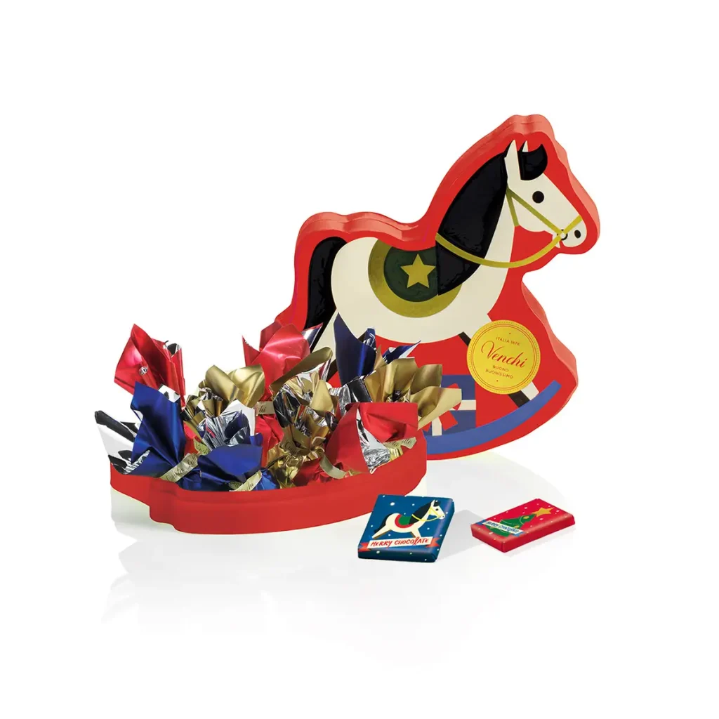 木馬型ギフト缶にチョコレート15個を詰め合わせ。